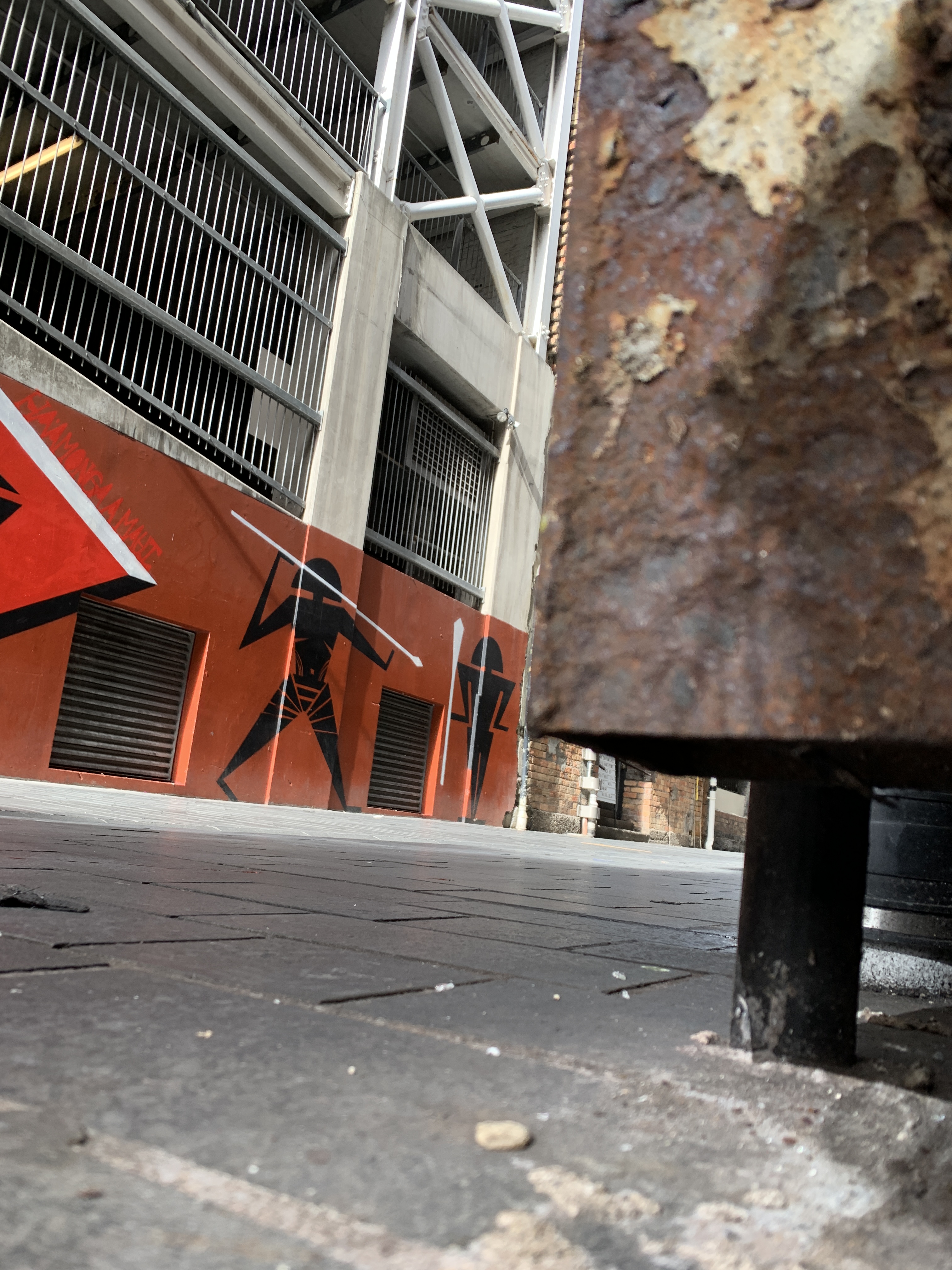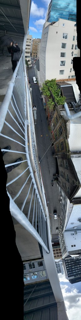 I had never visited this space before and I was amazed and very excited by this space on the height floor and looking down at Fort Lane from this height. Looking over the edge made me lightly anxious especially when taking photos with my phone over the edge. I loved the darkness of the carpark levels and the diagonal supporting structures. It was insightful to get a full view of the architecture surrounding and creating fort lane- the roof tops and kyskrapers glimmering in the sunlight.
