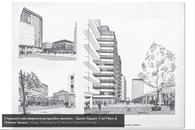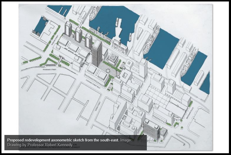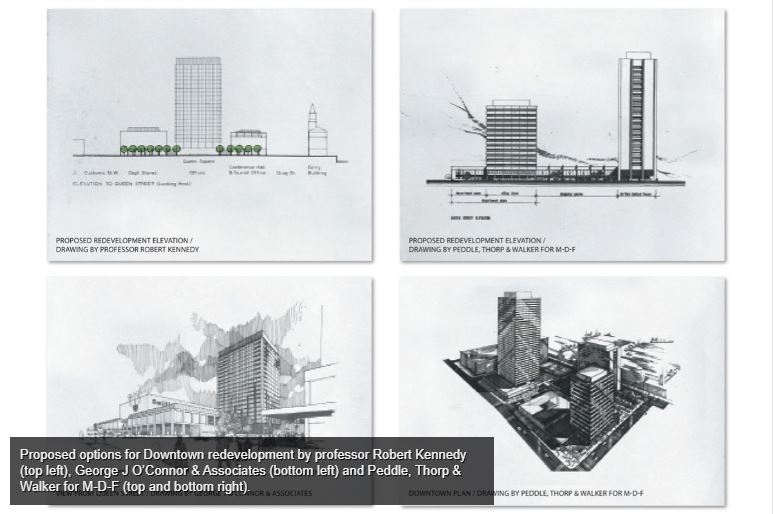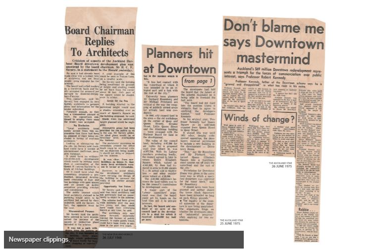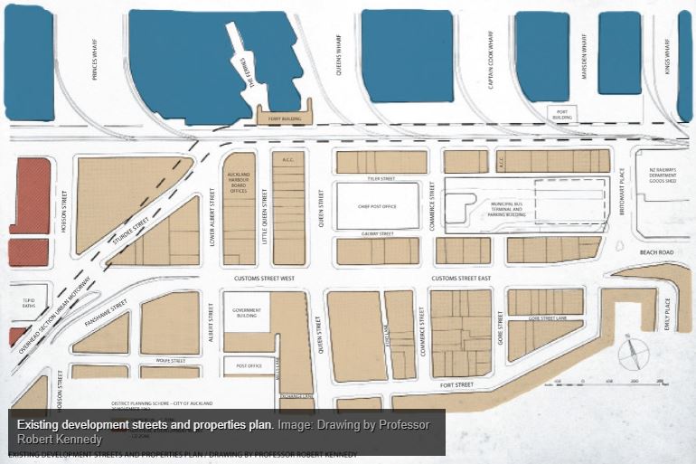 In 1963, Architect and Proffessor Robert Terence Kennedy was engaged by the AHB to assist with this renewal process. The study site was bounded by Quay Street, Britomart Place, Fort Street, Customs Street East and Hobson Street: a total of 13 hectares of which, excluding streets, the AHB owned 5 hectares, the Crown 0.5 and ACC 1.