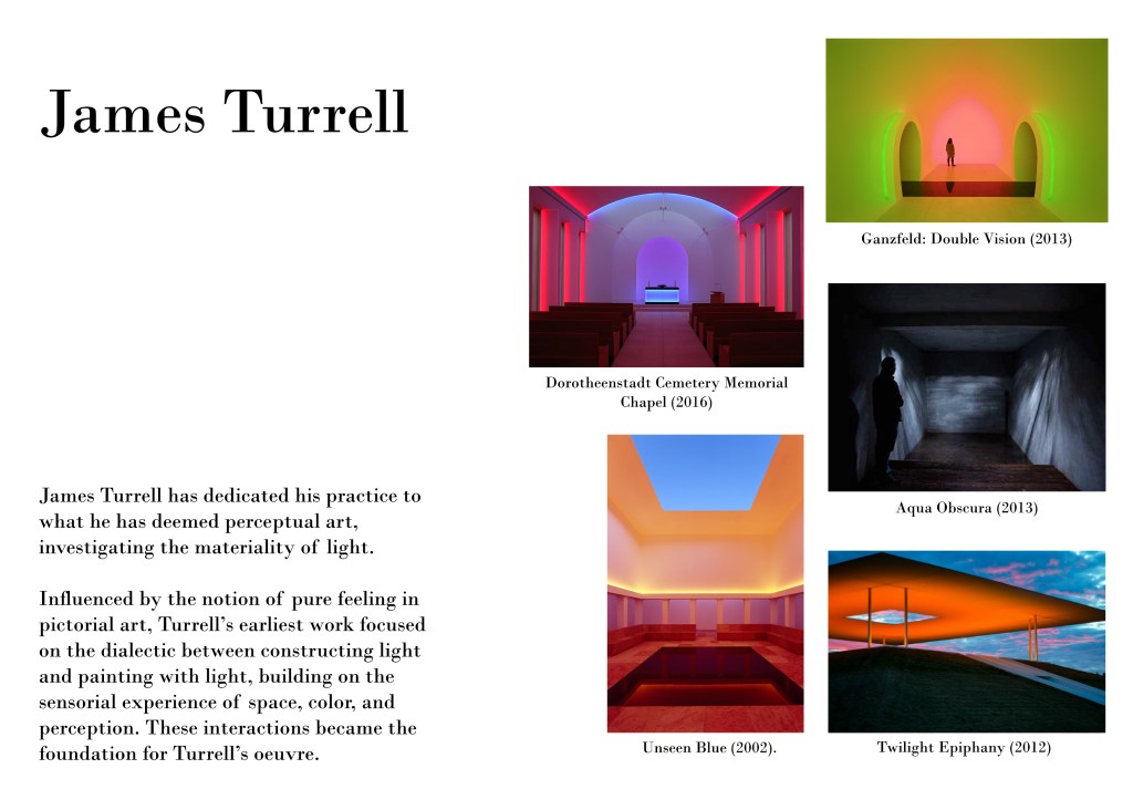 I love Turrell’s investigation of light as his primary material and the diversity of the affects he creates in his installations. To draw from sensory experiences, colour and perception is inspiring to me as a designer. To incorporate some of the aspects and concepts behind his work I would like to incorporate through this project. His works are cinematic pieces of art which viewers can experience first hand and not behind a screen. His piece “Aqua Obscura” is especially captivating to me as its so moody and I studied this technique and created my own camera obscura. But to create this projection with the shape and reflection of water is very tasteful and especially immersive.