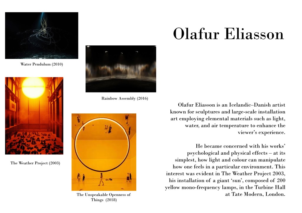 I am mesmerized by many of Eliasson’s works. I love his flexibility in media and colour tones to create very contrasting and heavy moods to immerse the public in his installations. The vibrancy in “The Weather Project” and “The Unspeakable Openness of Things” is very captivating – as you can see the public is completely in awe and taken by these pieces. The circle is a symbol of many things which can represent the simplicity, infinity, solar systems etc. I would like to use light, colour, projection and provoke emotion as he does as I aim to execute day to night- life to death transition.